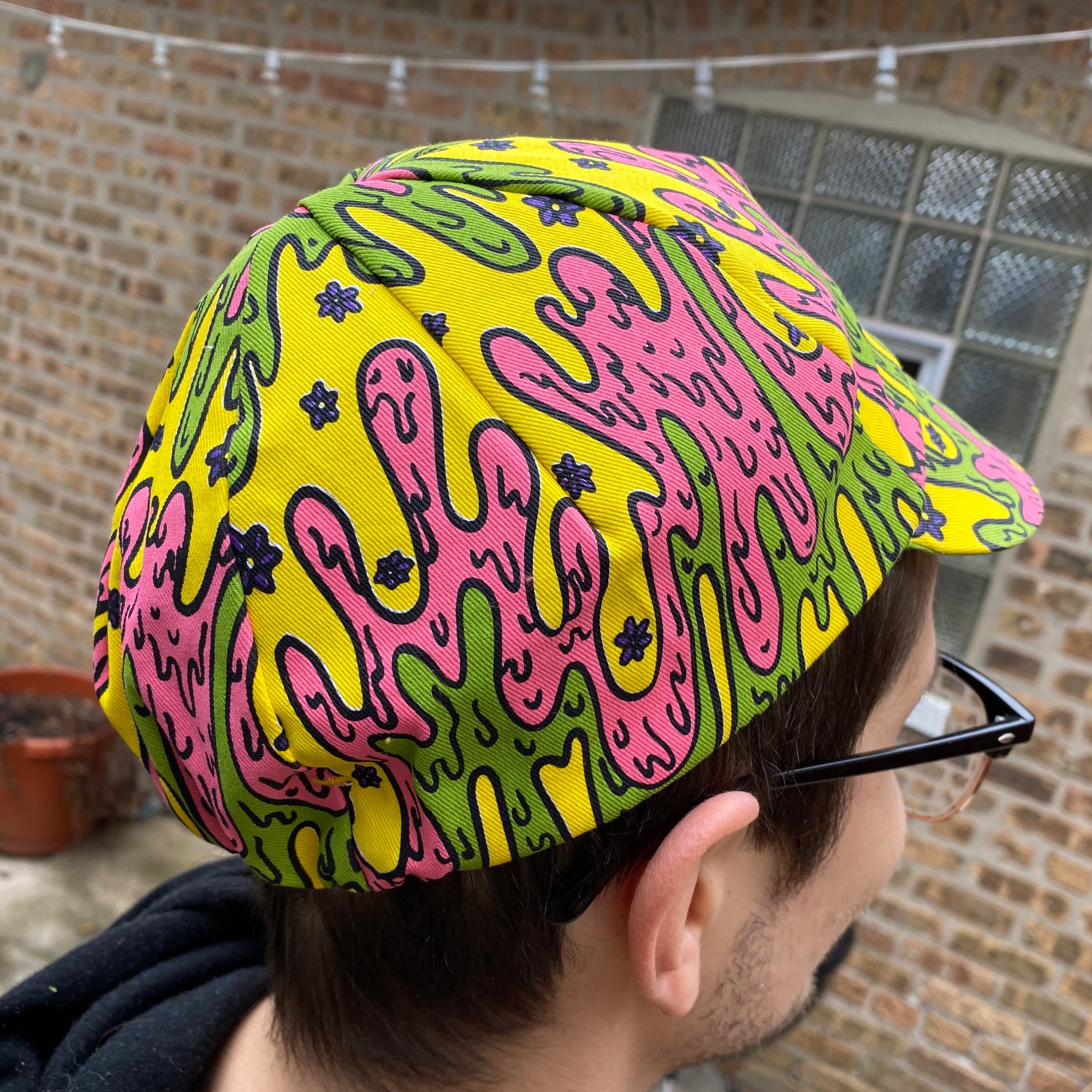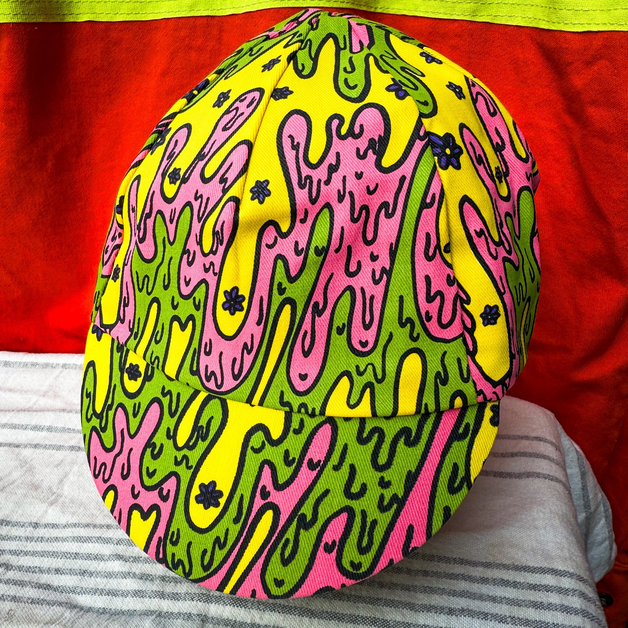 This edition of our cycling cap was illustrated by one of our own. Zelda Raygun aka Point Five, came up with this drippy design as part of a three piece set. Bright colors, 5 to be exact, printed and stitched here in the USA by Pace Sportswear.